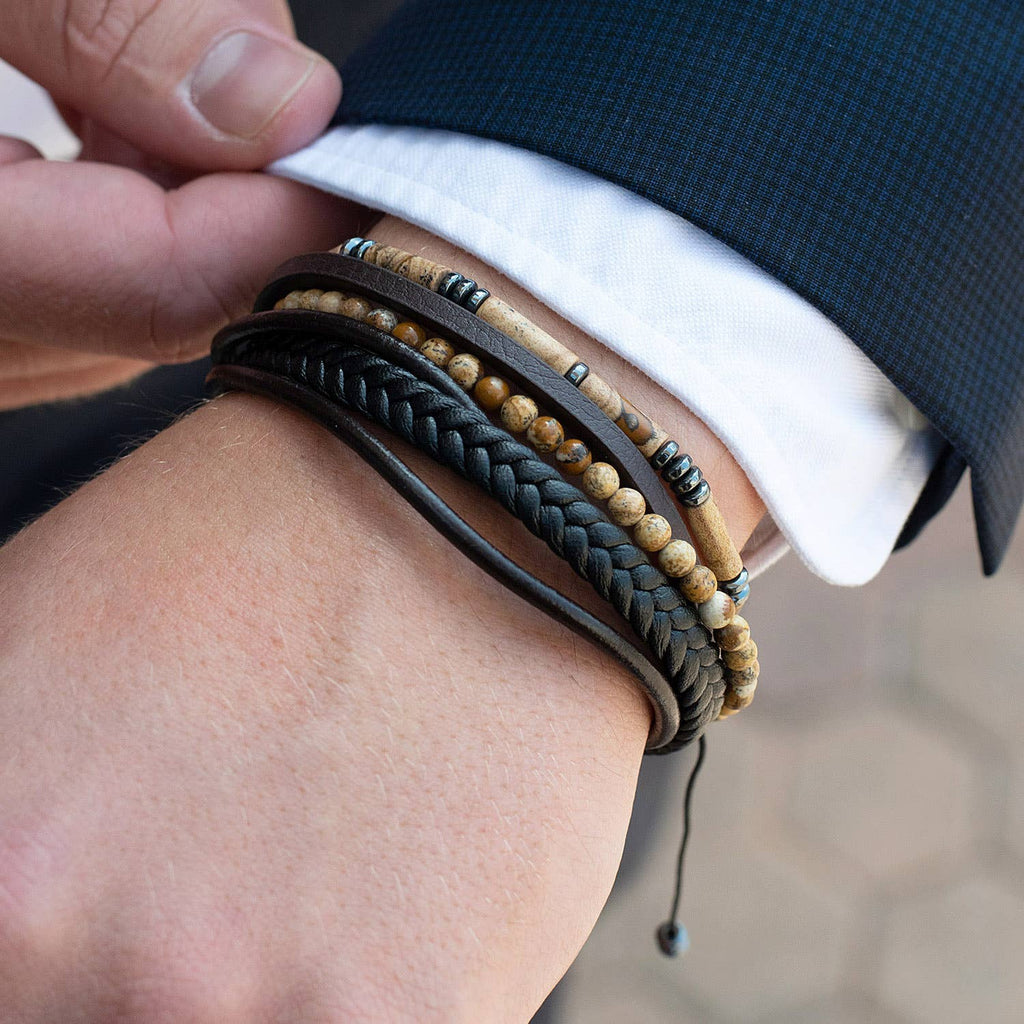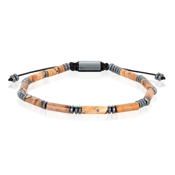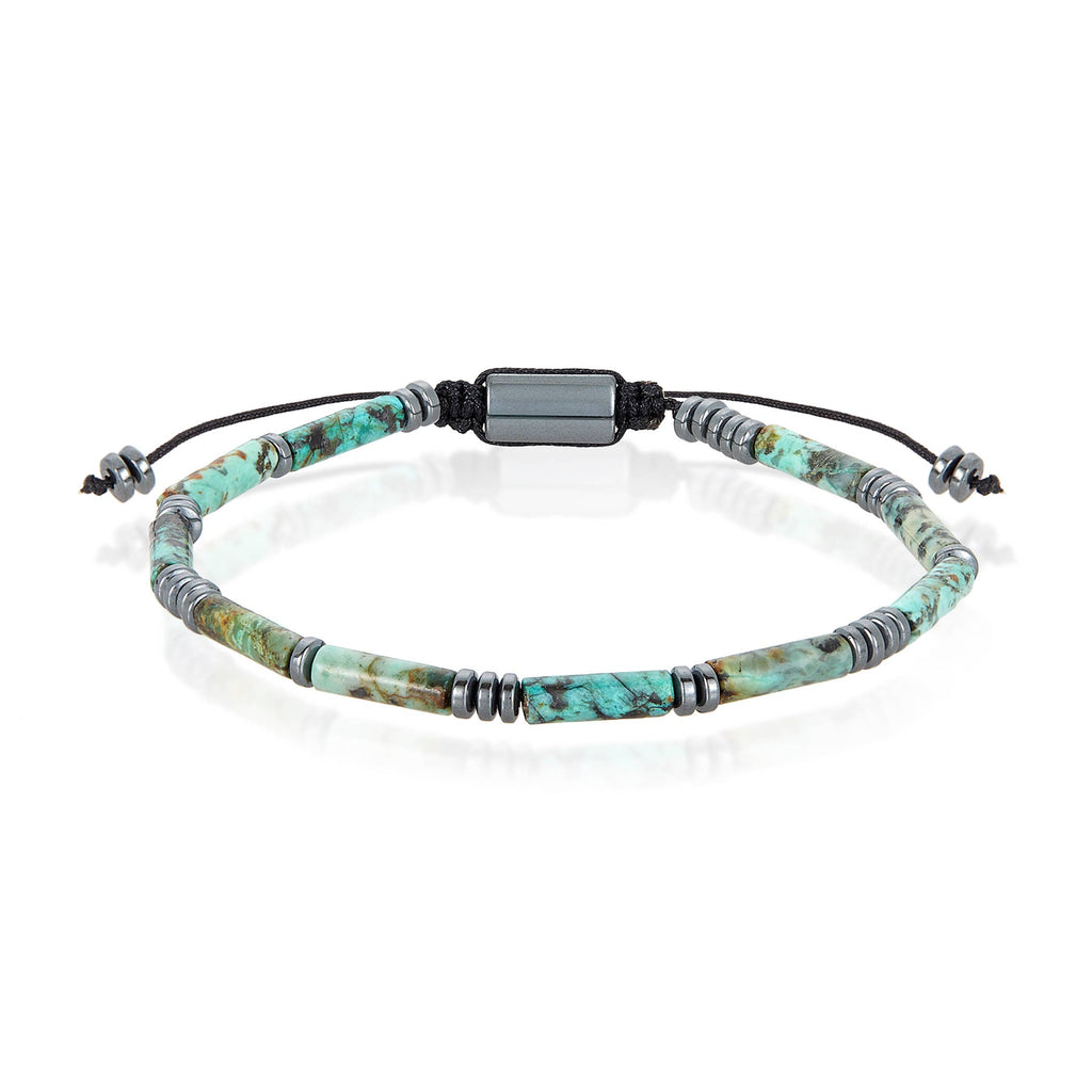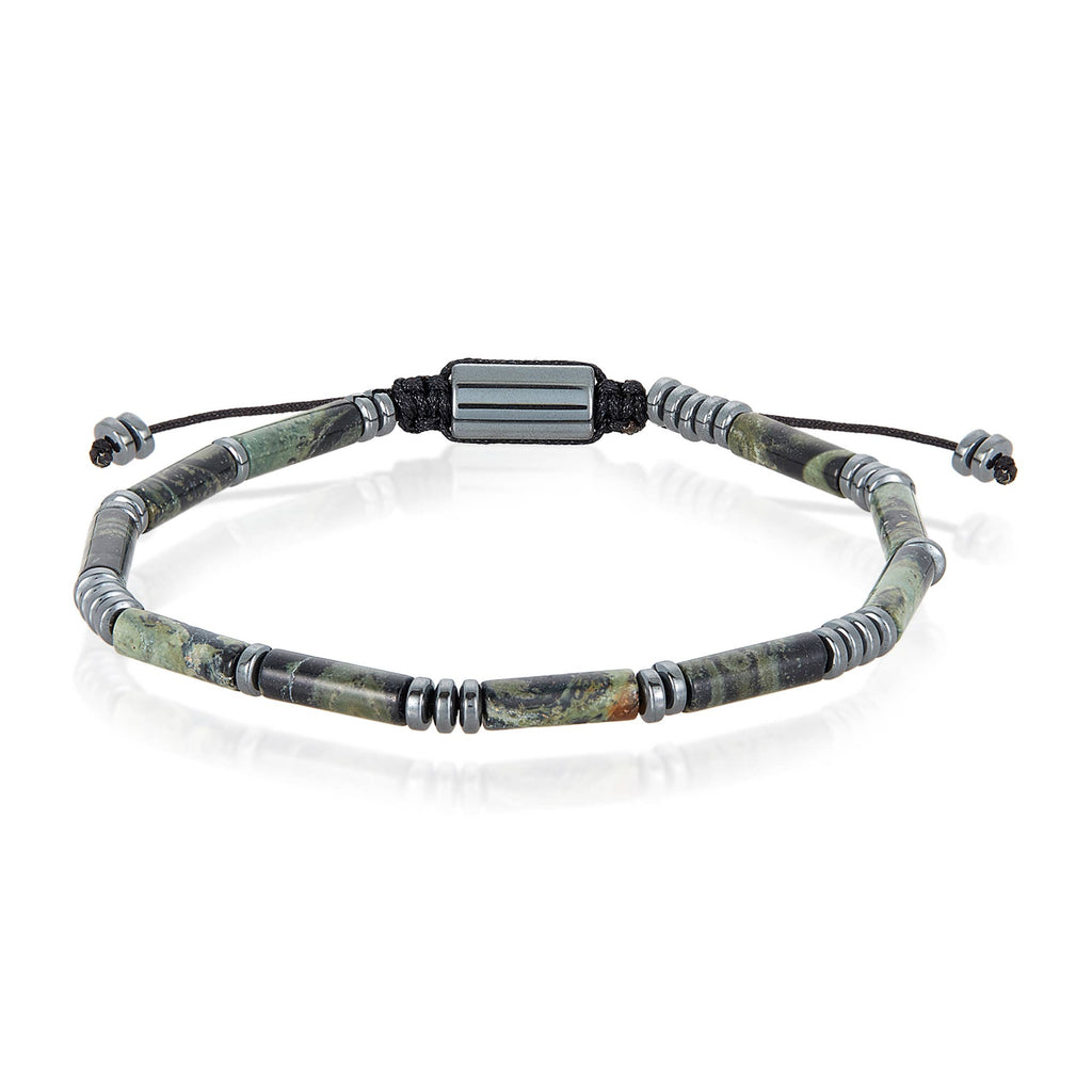 The adjustable bracelet has tube shaped natural stone beads paired with disc shaped Hematite stones.