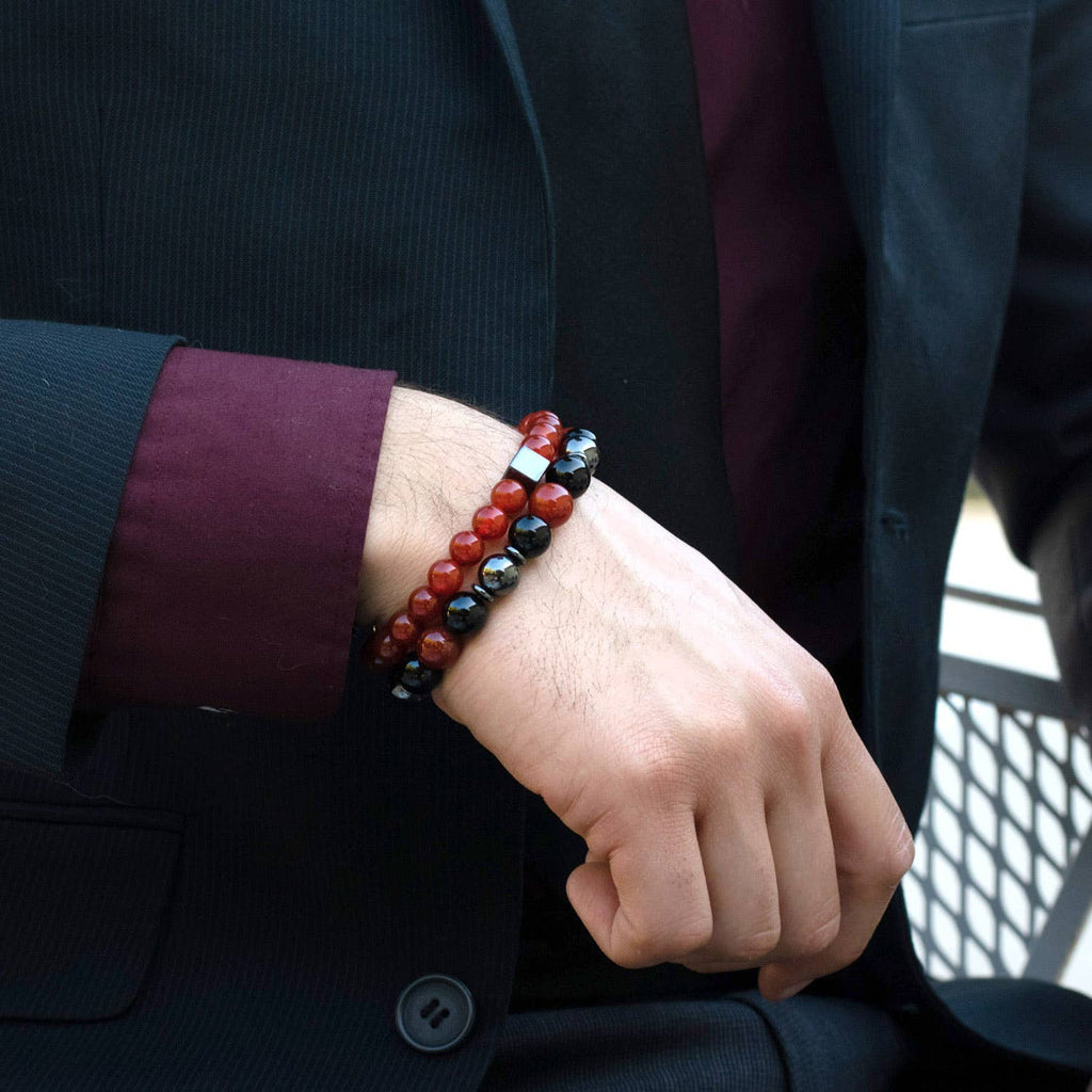 Natural Stone and Hematite Cube Bead Stretch Bracelet (8mm): Red Agate