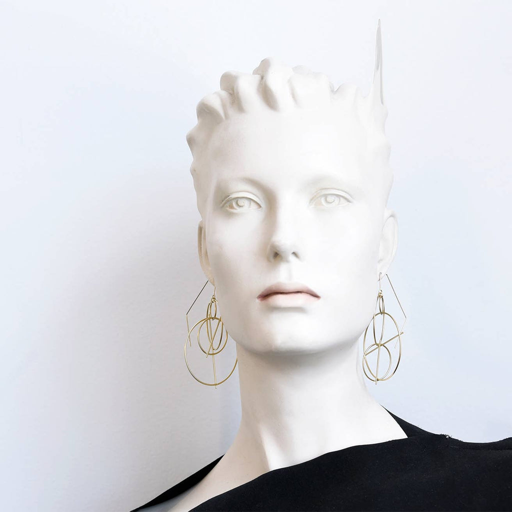 The Cirque earrings are the epitome of contemporary elegance. This captivating design features a unique arrangement of multiple rings, some with a bold slashed detail that lends an unexpected, fashion-forward twist. Lightweight and comfortable enough for all-day wear, the Cirque earrings seamlessly complement any outfit, from a casual daytime look to a glamorous evening ensemble. Materials All metals are brass finished with plating (see below) Finishing 12K Gold, Rhodium, *Black Zinc on brass (*Nickel Free) Dimensions: 2.5x3" overall