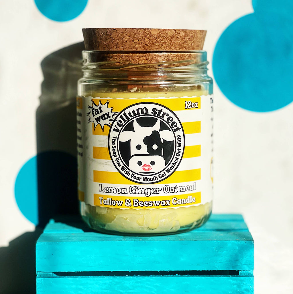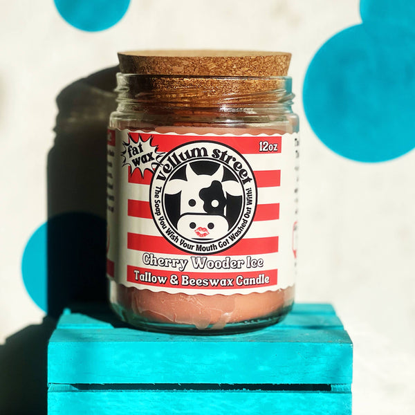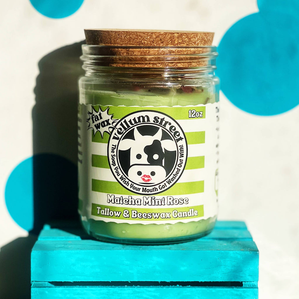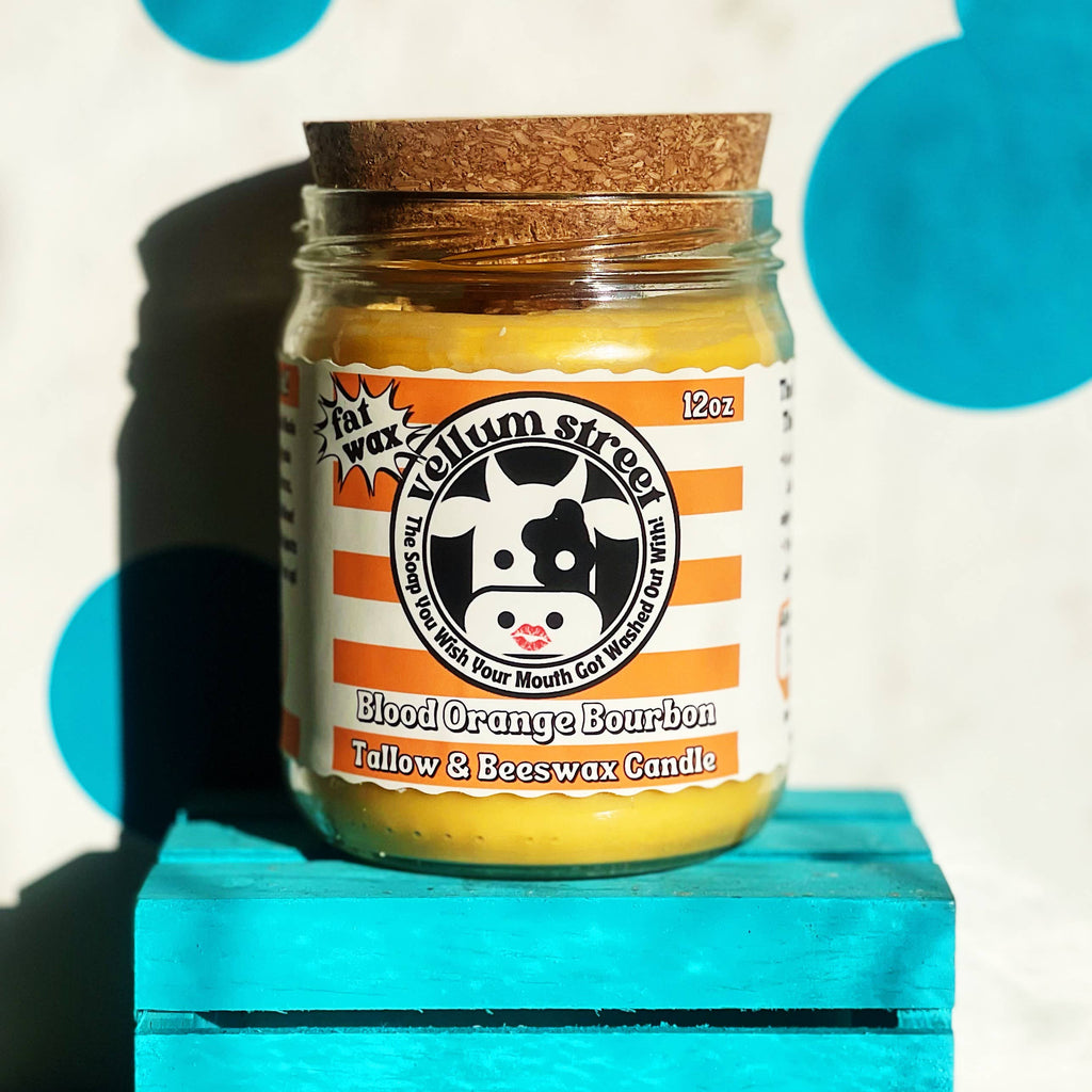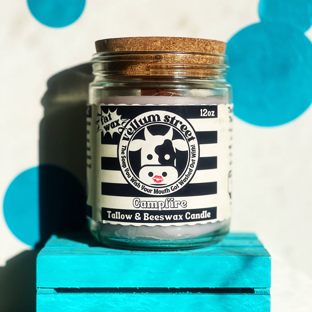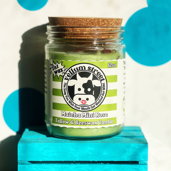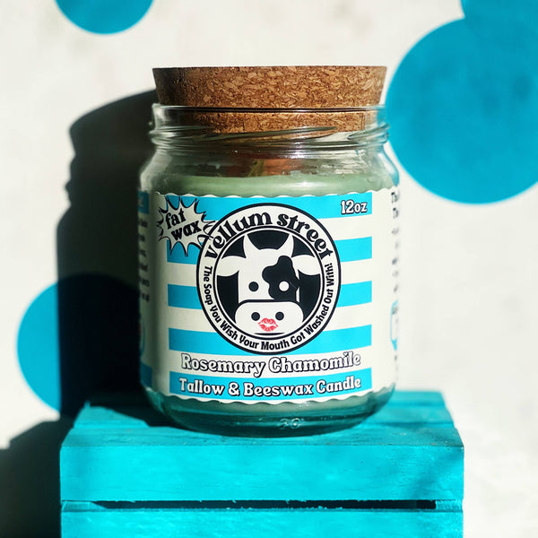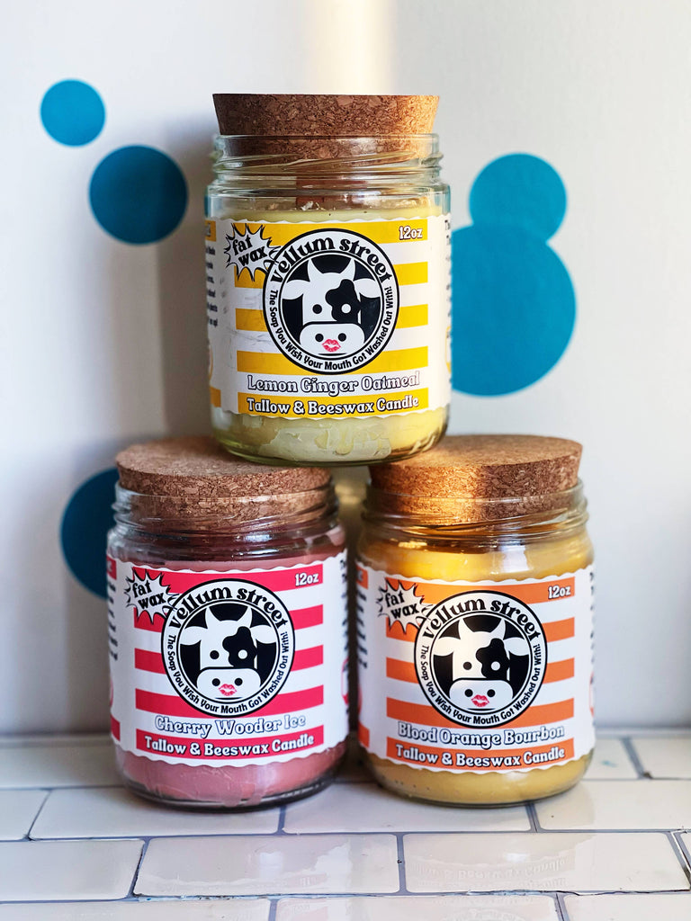 Starting with biocompatable grass fed tallow and beeswax, scented with essential oils, and colored with plants & clays, our candles can safely be used for aromatherapy or massage, so light 'em up! Burning trash has never smelled better! What you breath IN is just as important as what you put ON your skin or IN your mouth. Tallow & beeswax burn clean, as do our standard Wooden Wicks (which come with the audible bonus of a relaxing crackle). Our candles are poured into upcycled, post consumer glass (salsa jars for our 12 oz candles), processed by and purchased from non profit Bottle Underground in Philadelphia