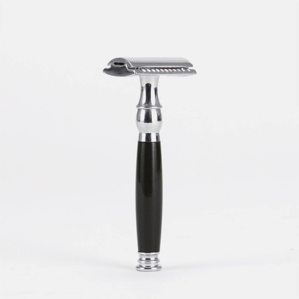 This solid and durable double edge safety razor sports a classic black handle with stainless steel detail. Made of coated brass and chrome. Its high quality performance paired with its stylish design makes this razor a staple for any shaving aficionado.