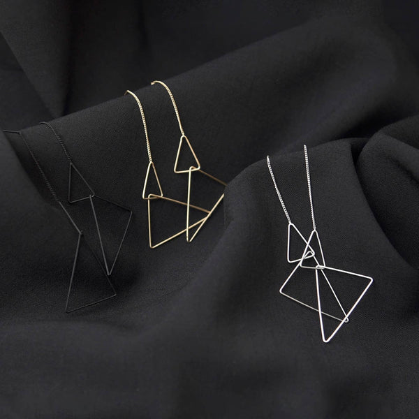These delicate ear drapes are formed of two interlocking triangles with dainty ear threaders. They swing back and forth gently and add the perfect amount of geometric fun to any outfit.