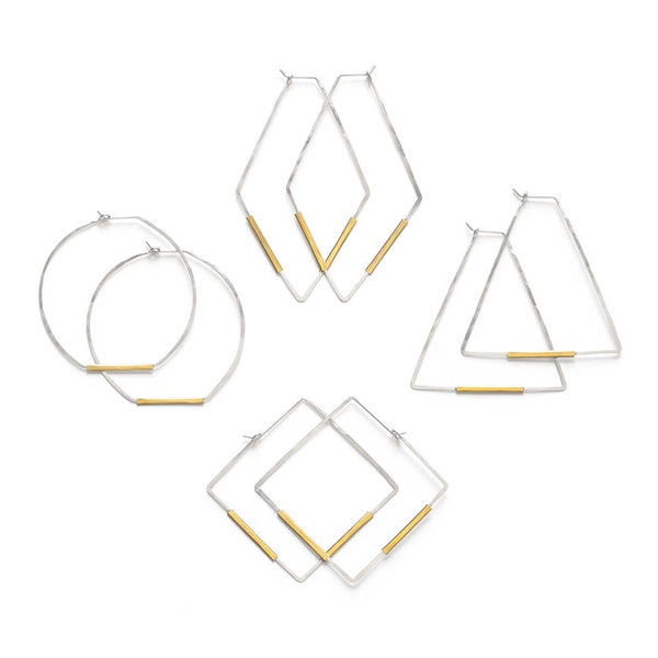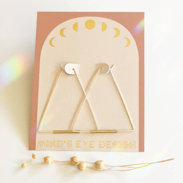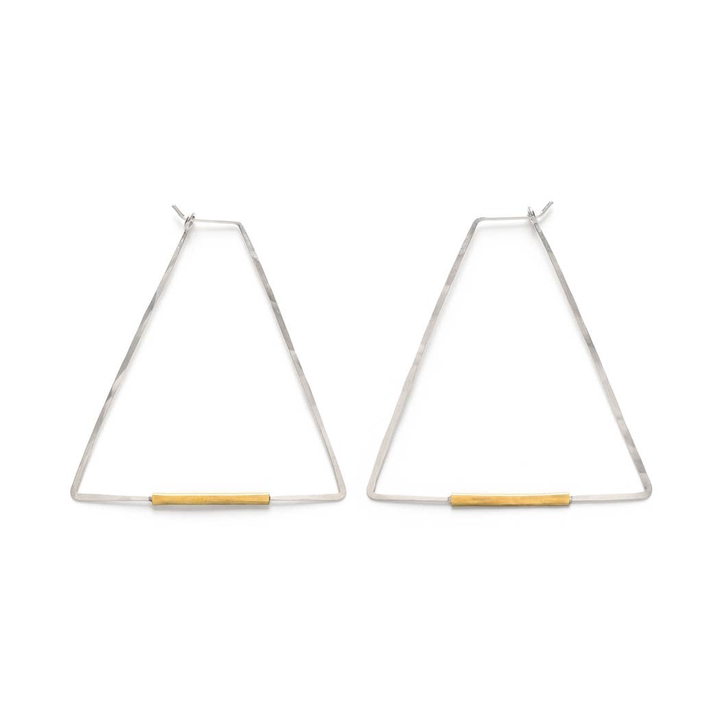 - Handcrafted Mixed Metal Triangle Hoops are made of Sterling Silver and Brass - Measure approximately 1.75" x 2" - Packaged on 3.5 x 4.5 card - Handcrafted in our studio