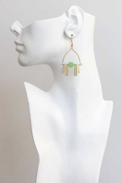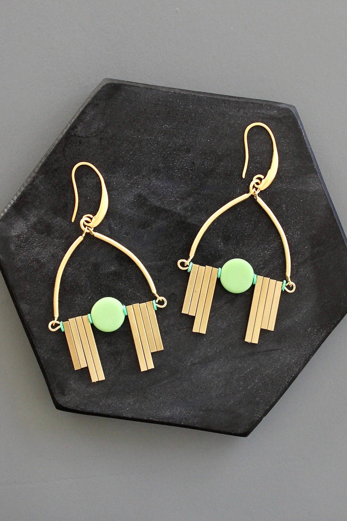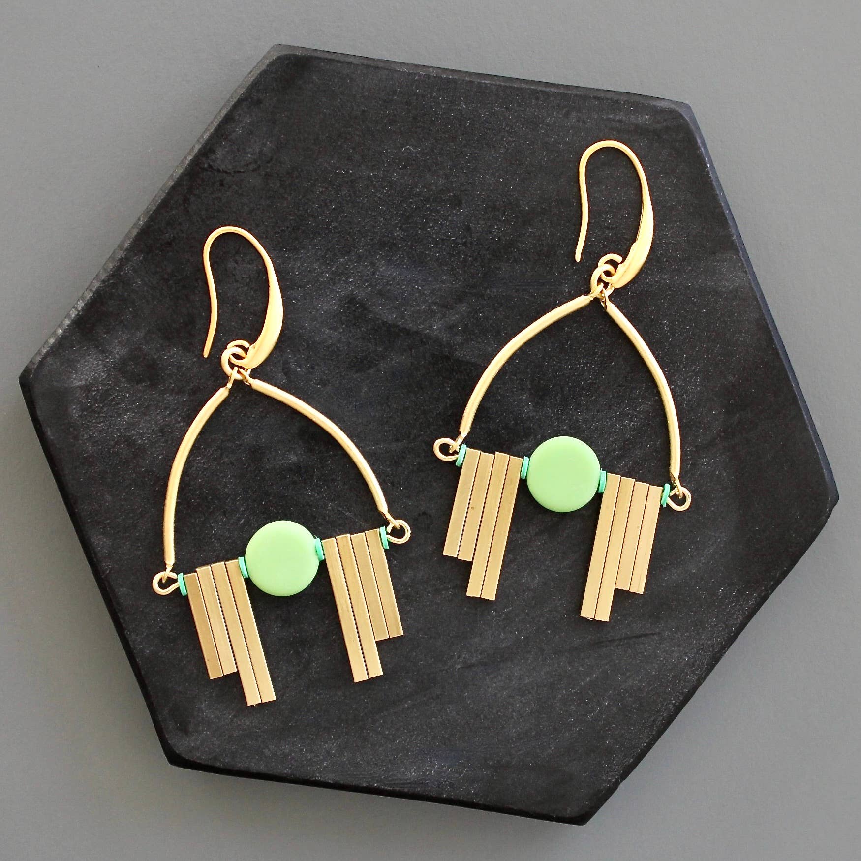 18k gold plated brass hooks with Czech glass and brass bars. Each earring weighs .23 oz. and measures 2.625 inches in length from top to bottom.