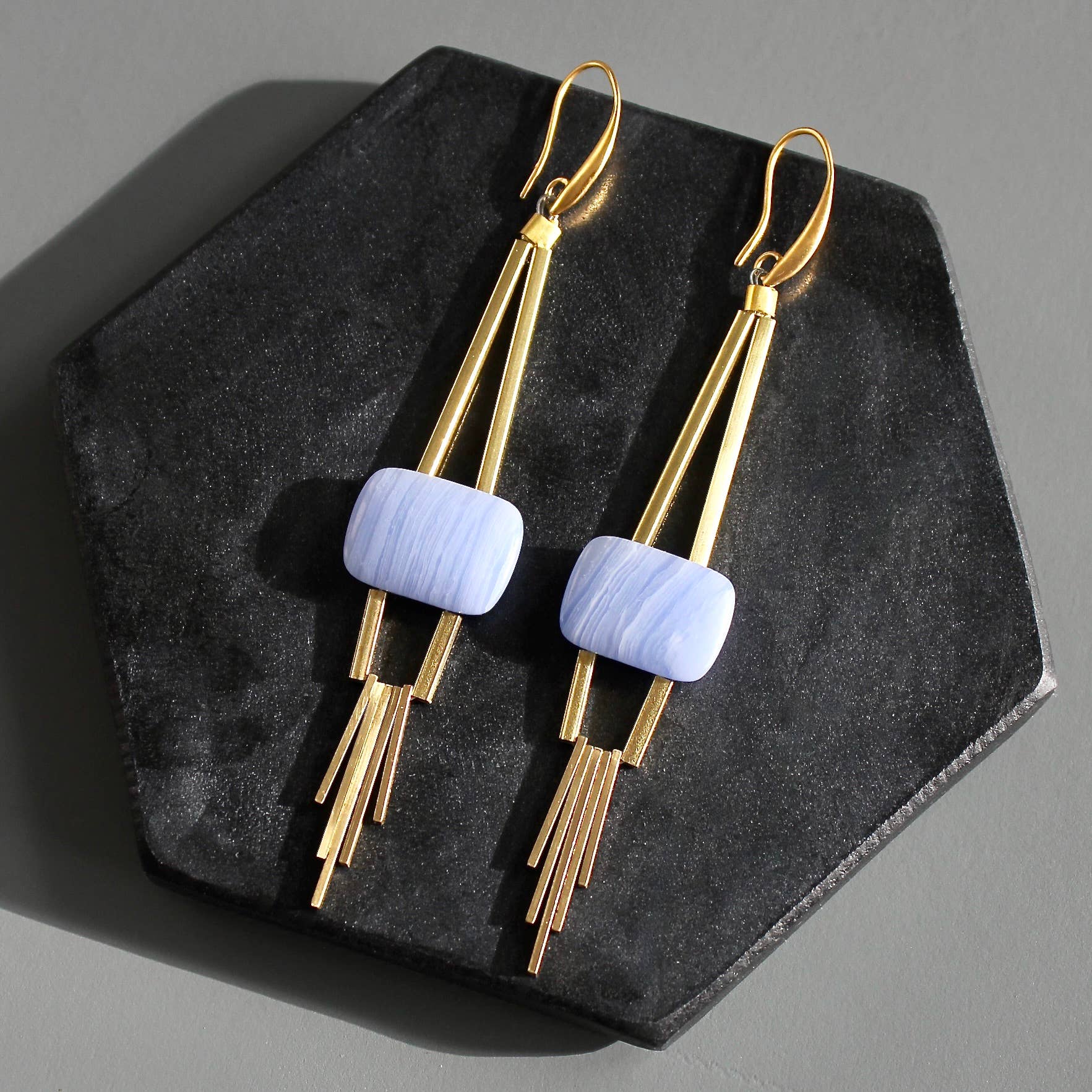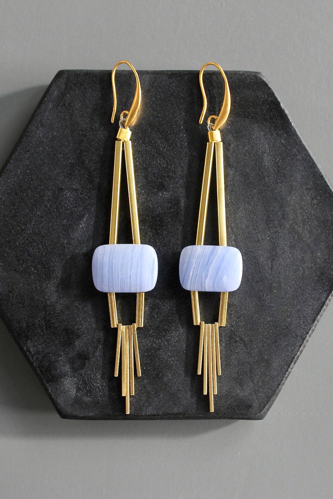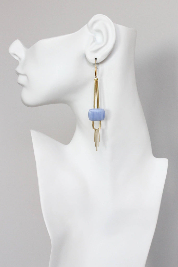 18k gold plated brass hooks with synthetic howlite and brass bars. Each earring weighs .18 oz. and measures 4 inches in length from top to bottom.