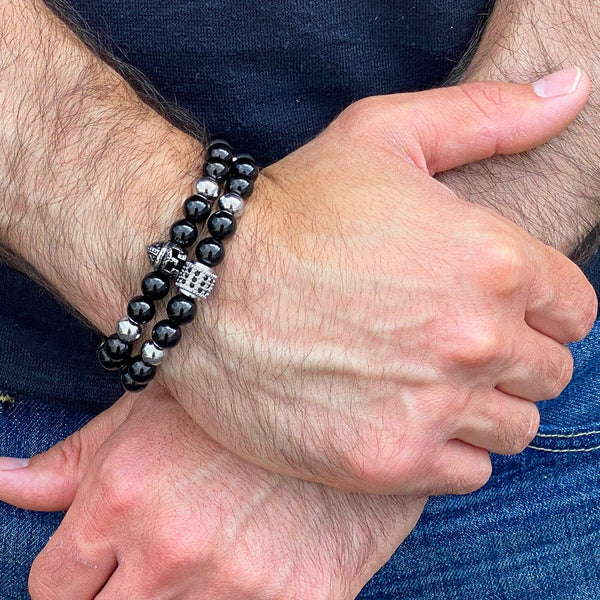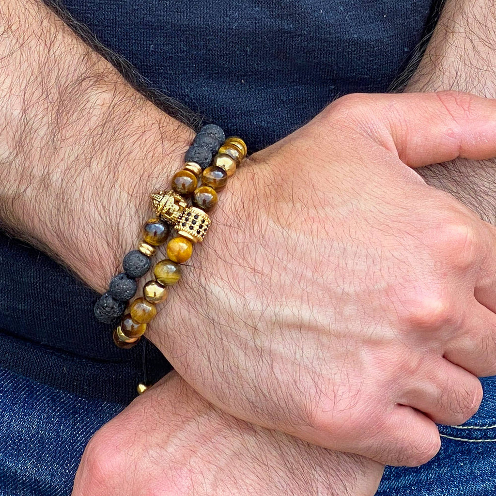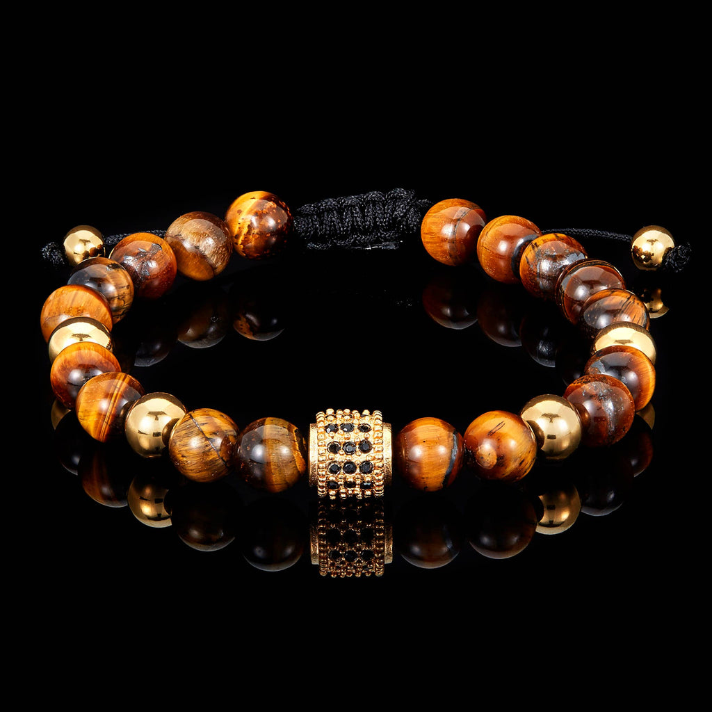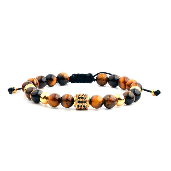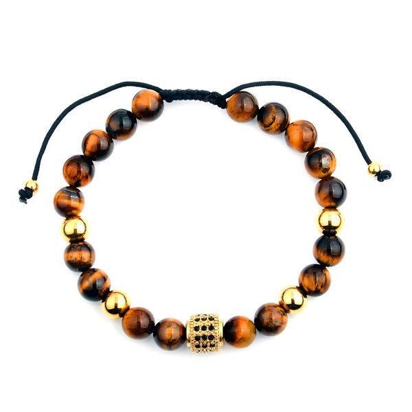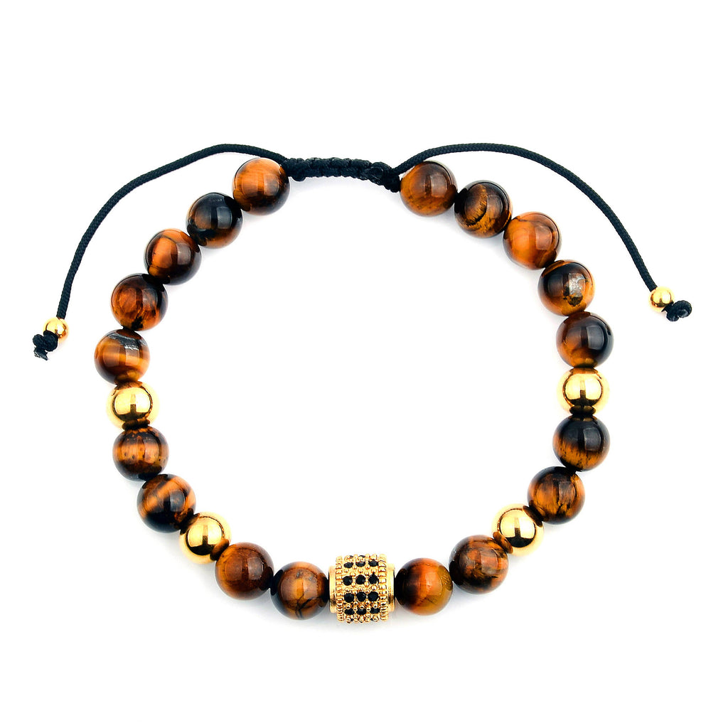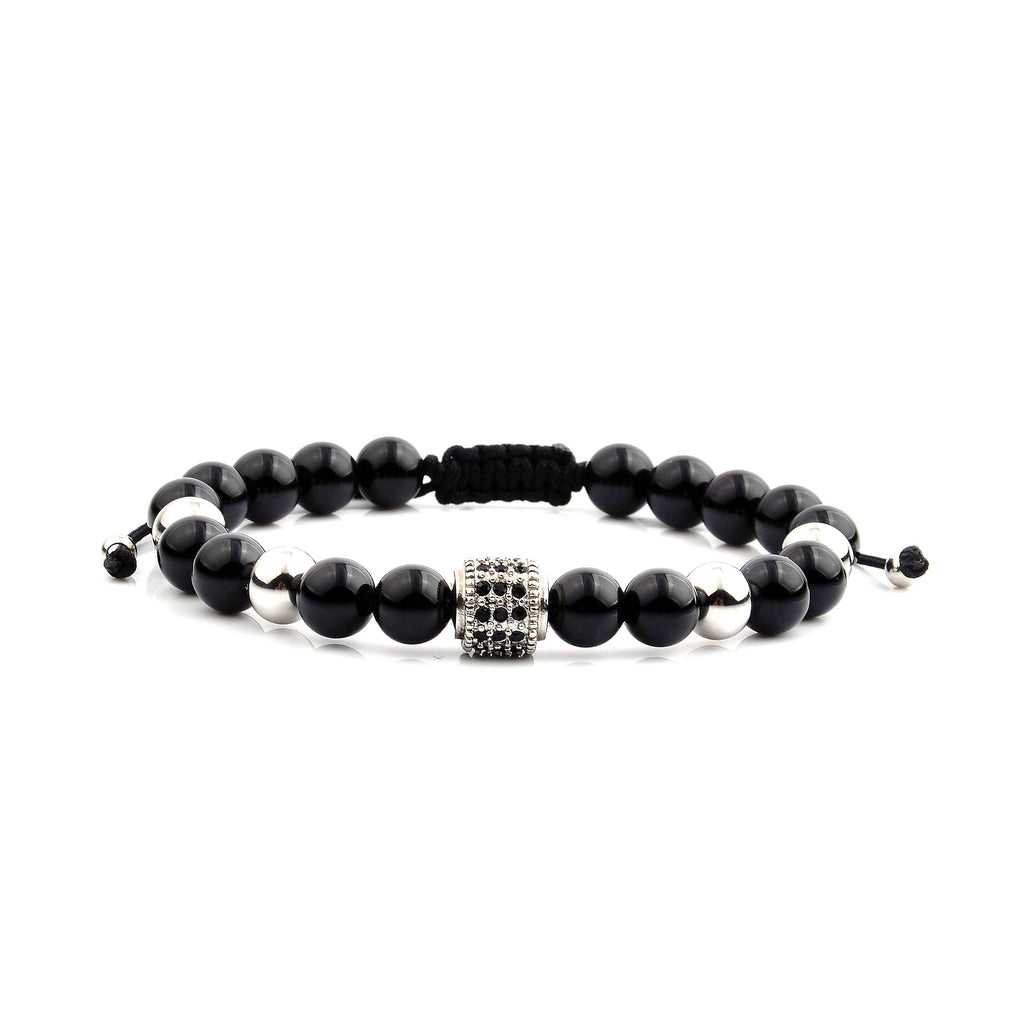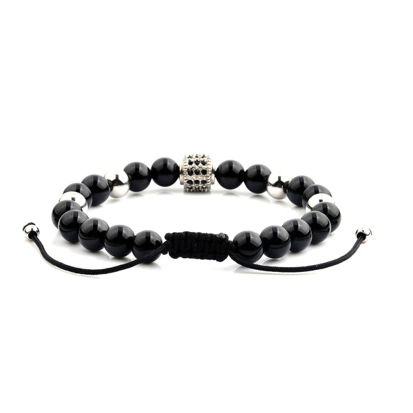Wear this stylish men's bracelet featuring polished natural stone beads and plated stainless steel center ribbed bead with cubic zirconia stone accents. This stone bead bracelet secures and adjusts with a shocker tie knot closure. The bracelet is adjustable to fit most wrist sizes.