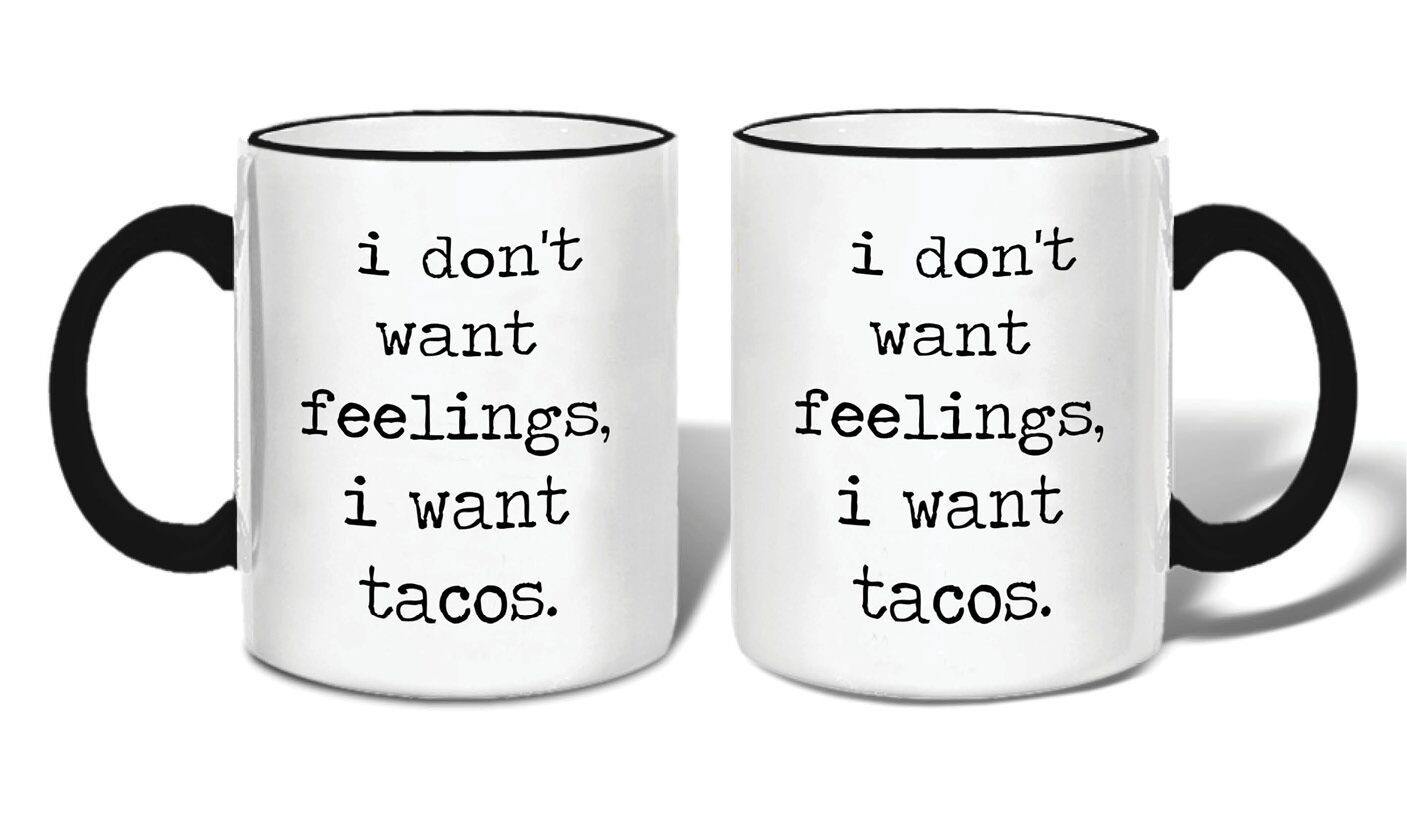 I Don’t Want Feelings, I Want Tacos. 11 oz ceramic mug. Microwave and dishwasher safe.
