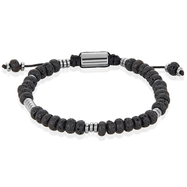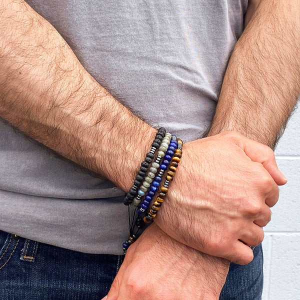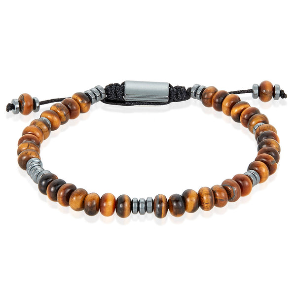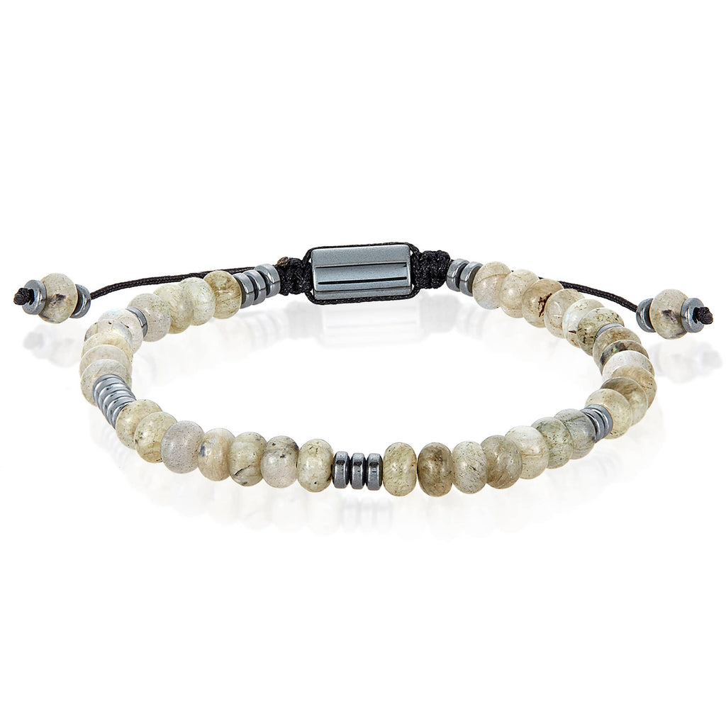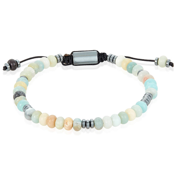 The adjustable bracelet has Rondelle shaped natural stone beads paired with disc shaped Hematite stones.