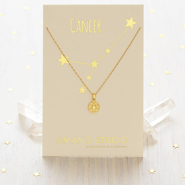 Adorable 1 cm diameter vintage zodiac medallions on 16" + 2" barley chain. 14k gold over brass + ecoat to resist tarnish and create a hypoallergenic surface. Carded on 100% recycled paper, letter pressed gold foil.