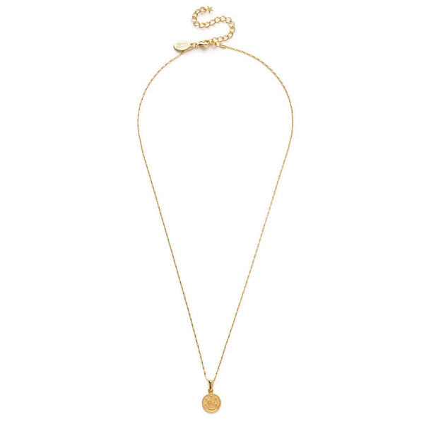 Adorable 1 cm diameter vintage zodiac medallions on 16" + 2" barley chain. 14k gold over brass + ecoat to resist tarnish and create a hypoallergenic surface. Carded on 100% recycled paper, letter pressed gold foil.