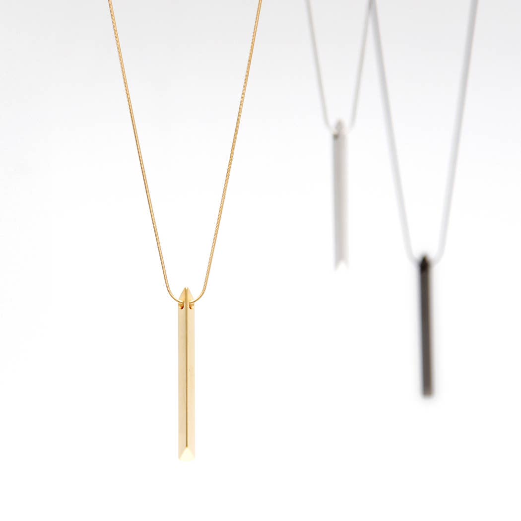 The striking solid pendant of this long necklace is a statement in itself! Each faceted bar is substantial enough to hang in an elegant line from the neck, while still being light enough to be comfortably worn all day long. A minimal staple piece for any wardrobe.