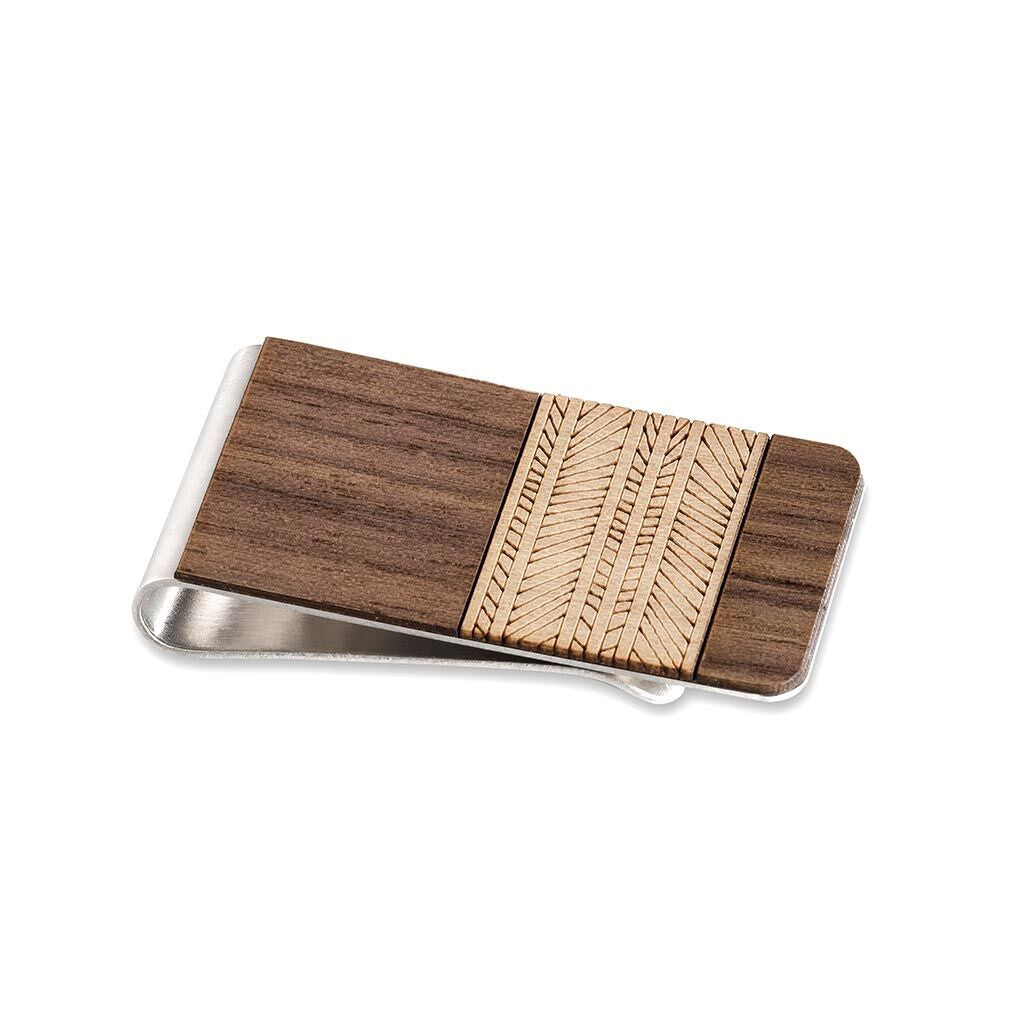 A clean and modern wooden money clip makes it easy to carry the essentials without the bulky wallet.